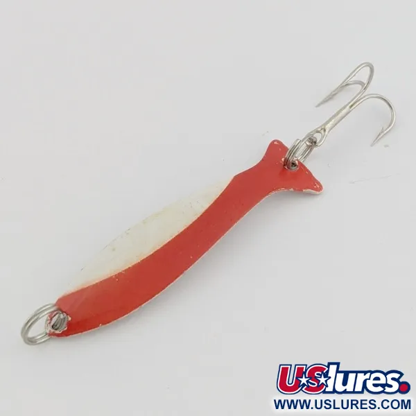 Rood-witte lak over een vernikkelde basis geeft deze Worth Fly Rod Demon een klassiek, opvallend profiel. Het gestanste metalen lichaam, met een lengte van 4 cm (1 1/2") en een gewicht van 1,5 g (3/64 oz), heeft een breed oppervlak dat specifiek is ontworpen voor het trollen. De actie blijft behouden bij lage snelheden, waardoor hij geschikt is voor het vissen op snoek in ondiepe plantenbedden of het opsporen van meerforel in diepe thermoclines met monofilament, leadcore of downriggers. De lak en het nikkel zijn in 4/5 conditie en hebben nog de originele glans van een vintage Worth kunstaas. Dit model staat geregistreerd onder code 24497.