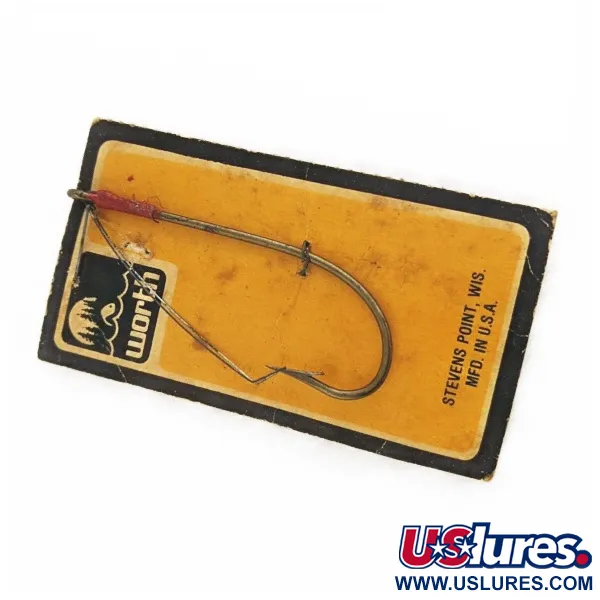 De vernikkelde afwerking zorgt voor een glanzend uiterlijk van deze weedless haak, ontworpen voor het vissen in dichte plantengroei. Een enkele draadbeschermer is bij het oog stevig vastgezet met handgewikkelde rode draad, waardoor de haakpunt vrij blijft van vuil en obstakels. Worth produceerde dit item, met productcode 24486, in hun fabriek in Stevens Point, Wisconsin. De haak zit nog op de vintage zwart-gele verpakkingskaart en verkeert in ongebruikte staat met een score van 6. De afbeelding op de verpakking toont het oude logo met gestileerde berg- en waterelementen, typerend voor de vroege branding van de fabrikant.