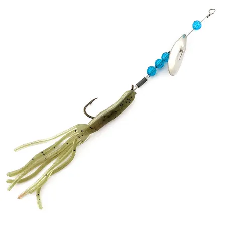 Nikkelen en blauwe componenten bepalen de visuele identiteit van het 20140-model, dat een klassieke benadering van Amerikaans hengelsportontwerp door Worth vertegenwoordigt. Met een lengte van 11 cm en een gewicht van 6 g beschikt het kunstaas over een kenmerkende June Bug-constructie waarbij het blad op een draadarm is gemonteerd. Deze specifieke opstelling wordt door sportvissers gewaardeerd om zijn betrouwbare opstart, waardoor het vernikkelde blad soepel draait zonder vast te slaan. De montage is geaccentueerd met drie gefacetteerde blauwe kralen onder het blad en een enkele bijpassende kraal bij het bevestigingsoog, wat zorgt voor visueel contrast tegen de metaalglans. Een soft plastic trailer in doorschijnend olijfgroen met zwarte glitters creëert een subtiel, getextureerd profiel achter het metaalwerk. De enkele haak is strak geïntegreerd in de softbody, en het geheel verkeert in een staat van 5/5 met heldere oppervlakken en goed bewaarde materialen. Het ontwerp van Worth is specifiek ontwikkeld voor technieken die een constante schittering en een gelijkmatige rotatie vereisen.