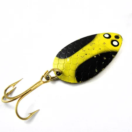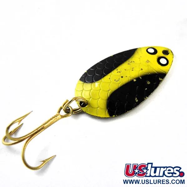 Duidelijk gestempeld in de messing achterzijde bevestigt de markering 'WRIGHT & McGILL 'PAY-MASTER' 1/4 OZ' de Amerikaanse herkomst van deze lepel. Met een lengte van 1 1/2" (3,5 cm) vertoont de lepel een opvallend geel en zwart schubbenpatroon dat doet denken aan een honingbij, geaccentueerd door twee duidelijke witte ogen bij de kop. De zware messing constructie zorgt voor het gewicht van 1/4 oz (7 g) dat nodig is voor verre worpen. Dit specifieke model, vermeld onder productcode 1054, verkeert in een solide 4/5 conditie waarbij de afwerking een goed bewaard gebleven levendigheid toont samen met de originele goudkleurige dreg. Historisch gezien paste Wright & McGill deze getextureerde schubbenafwerking toe om licht onder het geverfde oppervlak te vangen. Het beslag, inclusief de splitring en haak, is schoon en stevig bevestigd.