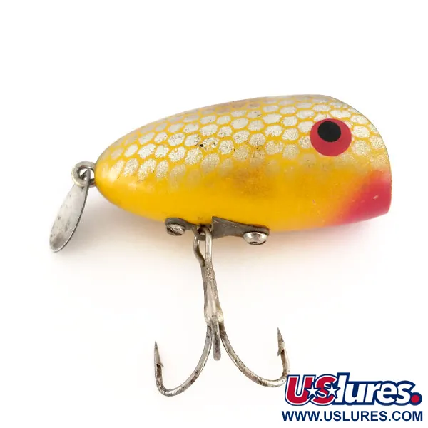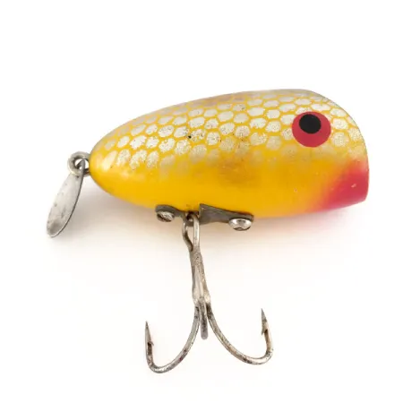 Met een lengte van 4,5 cm (1 3/4") is het compacte profiel van dit oppervlaktekunstaas een uitblinker voor het lichte werpwerk. Deze Wright & McGill Rustler van 10 g (1/3 oz) heeft productcode 9813 en is ontworpen voor een diepte van 0 m (0 ft) of zeer ondiep binnenvissen. Het lichaam heeft een felgele afwerking met daaroverheen een honingraat-schubbenpatroon dat overgaat in een kenmerkend zwart concaaf gezicht. Een rode kleuraccent bedekt de onderkant van de bek en omringt de grote zwarte pupillen. Aan de staart is een klein metalen blad bevestigd voor extra schittering, terwijl de buikhaak is gemonteerd via een gespecialiseerde metalen plaat met een enkele dreg. Dit exemplaar is beoordeeld in conditie 5/5, waardoor de klassieke esthetiek van vintage Amerikaans vakmanschap behouden is gebleven.