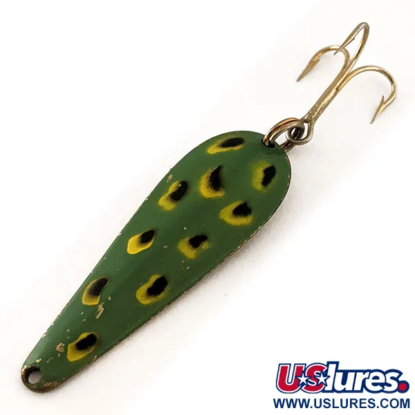 De basis van deze druppelvormige lepel van 4,5 cm (1 3/4") wordt gevormd door een messing constructie. De markeringen Wright & McGill en Streamliner zijn direct in de achterzijde van het metaal gestanst en zijn scherp en goed leesbaar, wat dit exemplaar identificeert met productcode 11704. De voorzijde is afgewerkt in een traditioneel Frog-patroon, met een diepe olijfgroene basis versierd met geelgerande zwarte stippen die een natuurlijke prooi nabootsen. Met een gewicht van 7g (1/4oz) is het kunstaas voorzien van een goudkleurige dreg die met een splitring aan het brede uiteinde van de body is bevestigd. Dit in de VS gemaakte kunstaas verkeert in een staat van 5/5, waarbij de lak zijn originele glans heeft behouden en de messing achterzijde een schone, heldere uitstraling heeft. De vorm van het metaal richting het oog voor de lijn wijst op een ontwerp dat bedoeld is voor het werpen of trollen in diverse zoetwateromstandigheden.