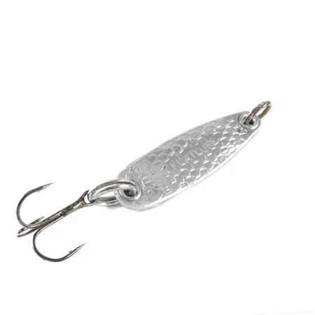 Met een opvallend schubpatroon op het metalen lichaam is deze 44g Zip Flatlure een robuust, in de VS vervaardigd verticaalaas. Met een lengte van 6 cm heeft het kunstaas een gepolijste zilveren afwerking die het gestructureerde oppervlak benadrukt. De reliëfletters 'FLATLURE' en 'TRADE MARK' blijven scherp op de zijkant van het metaal en identificeren dit specifieke in de VS geproduceerde model onder productcode 1694. Dit exemplaar verkeert in 5/5 conditie, met een glanzend oppervlak en goed bewaarde onderdelen, inclusief de originele splitringen. Aan de staart is een enkele dreg bevestigd, bedoeld voor diepwaterjiggen of verre worpen.