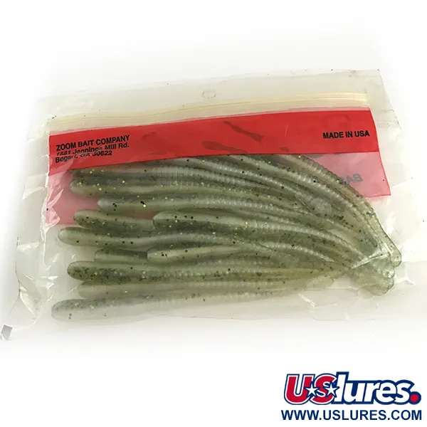 Met een lengte van precies 4" (10 cm) zijn deze slanke softbaits een vaste waarde voor finesse-liefhebbers die op zoek zijn naar een subtiele presentatie. Dit specifieke pakket Zoom Meatheads, herkenbaar aan productcode 6667 (en gelabeld 024-114), is uitgevoerd in het iconische Baby Bass kleurenschema: een doorschijnende groene basis met veel donkere en glinsterende groene glitters. Hoewel de originele verpakking 20 stuks vermeldt, bevat deze vintage set 19 ongebruikte kunstaasjes die hun originele textuur en uiterlijk hebben behouden. Geproduceerd in de VS, maakt het ontwerp gebruik van een geribbeld lichaamsdeel dat overgaat in een dunne, platte staart, een configuratie die vaak de voorkeur geniet voor drop-shot of split-shot montages. Het kunstaas is in ongebruikte staat en ziet eruit alsof het decennia geleden zo uit het schap van een hengelsportzaak is gehaald. Elke worm is voorzien van de 'Better Than Salt'-formule die vermeld staat op de klassieke rood-gele kaart van de Zoom Bait Company.